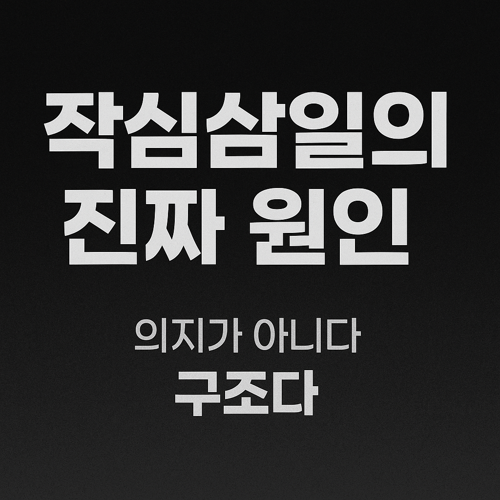 작심삼일이 반복되는 사람의 문제는 의지가 약해서가 아니다.대부분은 시작을 ‘행동’이 아니라 ‘설계’로 착각한다.루틴을 세우는 순간부터 이미 실행 중이라고 느끼고, 그 착각이 오늘의 행동을 빼앗는다.계획은 행동 없이도 성취감을 준다.그래서 작심삼일의 첫날은 대개 “잘 짠 계획”으로 끝난다. 완벽한 루틴을 찾는 심리는 합리적으로 보이지만 구조적으로는 회피다.완벽을 기준으로 잡는 순간, 시작은 언제나 미달이 된다.미달인 시작은 실패처럼 느껴지고, 실패를 피하려고 사람은 시작을 미룬다.이때 루틴은 삶을 바꾸는 장치가 아니라, 아직 안 해도 되는 이유를 생산하는 변호사가 된다.“조금만 더 다듬고”는 개선이 아니라 판정을 미루는 문장이다. 작심삼일을 끊는 핵심은 루틴을 최적화하는 게 아니라, 시작의 비용을 낮추는 ..